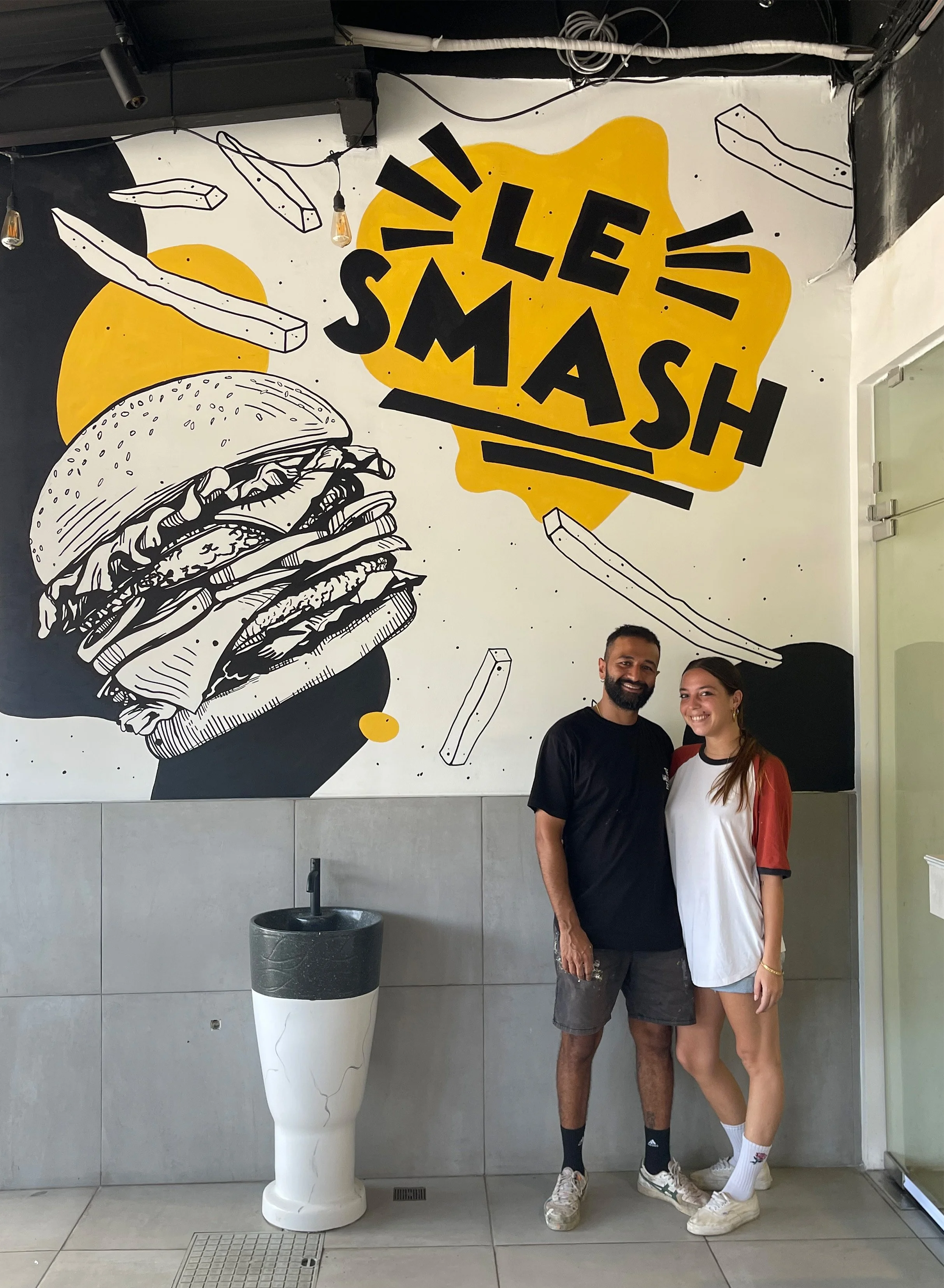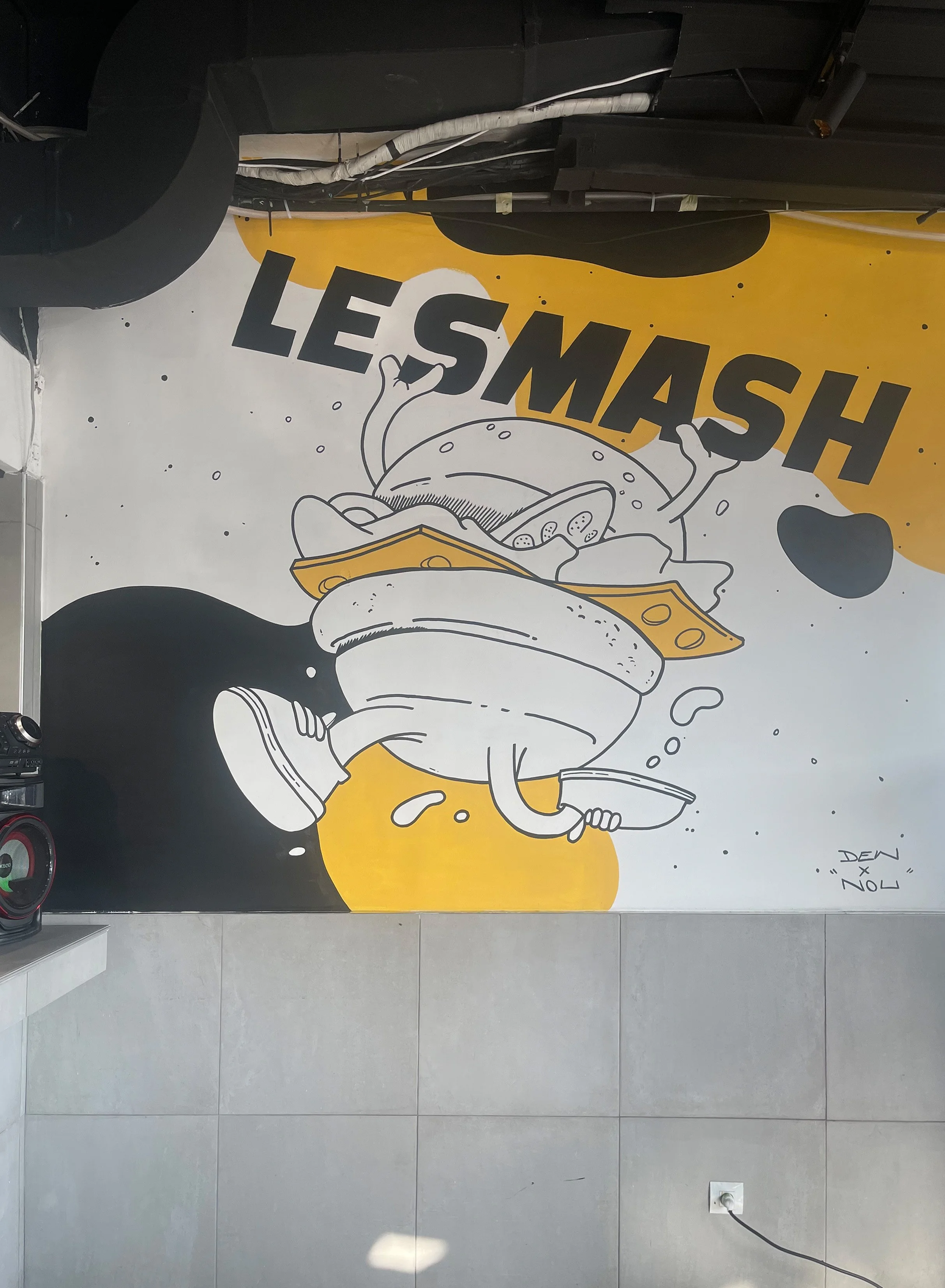 A collaborative project from 2024 with Nou! featuring two walls designed for Le Smash Burgers in Abidjan, Zone 4.